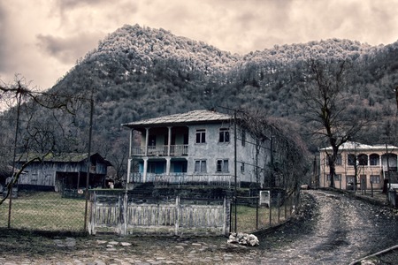 Typical old family houses in villages of Abkhazia in mountains background. Two-storey house with veranda and balustrade twined with vine, wintertime. Black sea coast of Caucasus, Caucasian mountains