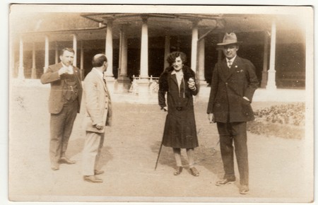 KARLOVY VARY, THE CZECHOSLOVAK REPUBLIC - CIRCA 1930s: Vintage photo shows the elegant men and woman at the spa resort. Men wear slack suits. Colonnade is on background.