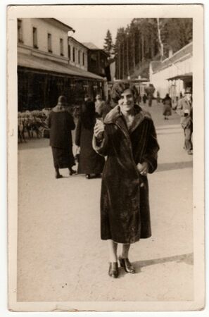 THE CZECHOSLOVAK REPUBLIC - CIRCA 1930s: Vintage photo shows woman wears a fur coat, goes for a walk Retro black & white phortgraphy.