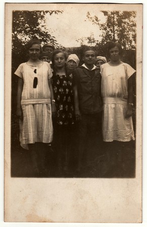 THE CZECHOSLOVAK REPUBLIC - CIRCA 1940s: Vintage photo shows a group of people poses outdoor. Retro black & white photography.