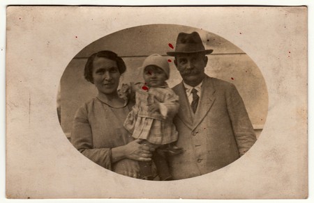 KOVCIN U OLSAN, THE CZECHOSLOVAK REPUBLIC - DECEMBER 20, 1923: Vintage photo shows mother holds a small baby and father. Retro black & white photography.