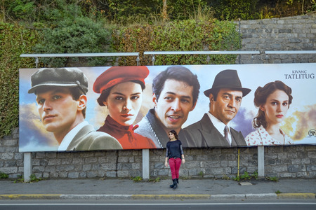 Istanbul, Turkey - October 20, 2013: Turkish film The Butterfly's Dream movie posters and street people showing interest. The Butterfly's Dream, poetic life subjects, written and directed by Yilmaz Erdogan made the 2013 drama.