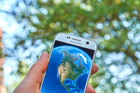 MONTREAL, CANADA - MAY 23, 2016 : Google Earth application on Samsung S7 screen. Google Earth is a virtual globe, map and geographical information program that was originally called EarthViewer 3D.