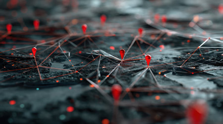 A striking representation of a digital network featuring red pins connected by lines, illustrating data connections and communication in a modern tech landscape.