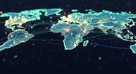 A luminous world map glows in the dark, showcasing a complex web of interconnected data points and communication lines. This visualization represents the pulse of the global economy, illustrating international trade routes, digital information flow, and the futuristic infrastructure of a connected planet.