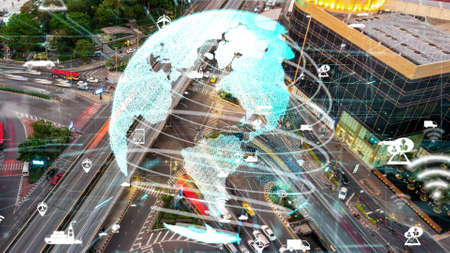 Smart transport technology concept for future car traffic on newish city road . Virtual intelligent system makes digital information analysis to connect data of vehicle on city street .