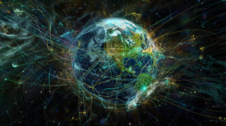 Planet Earth is depicted with a glowing network of blue and green interconnected lines symbolizing global communication.