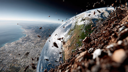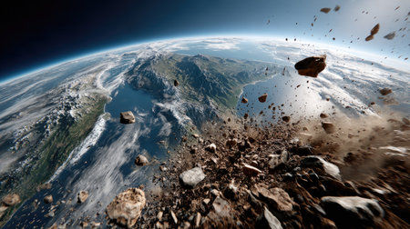 A breathtaking perspective of Earth from space, showcasing asteroids and debris hurtling through the atmosphere, with a clear view of the planet's surface, mountains, and oceans.