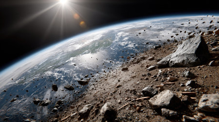 This captivating image showcases a breathtaking view of Earth from space, with asteroids and cosmic debris illustrating the vastness of the universe.
