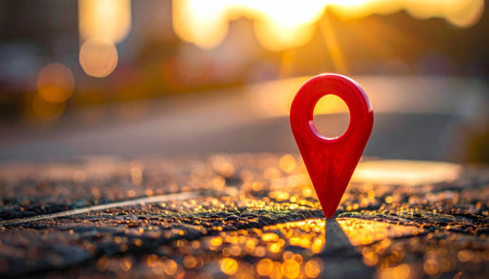 A red map pin marker is placed on a textured surface, illuminated by warm sunset bokeh lights in the background.