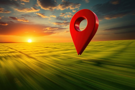 A vibrant red location pin stands rooted in rich soil amidst tender green shoots as the sun sets, casting a warm glow and creating a striking contrast that captivates the eye.