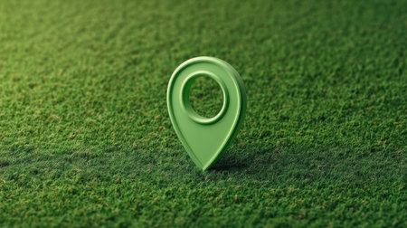 A vibrant green location pin marker stands on a lush grass surface, symbolizing navigation and exploration in outdoor and nature-themed contexts. Ideal for travels.