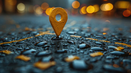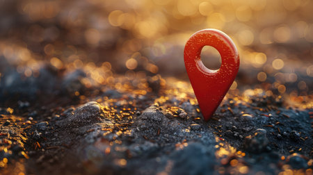Red Map Location Pin on Wet Ground with Golden Bokeh Background