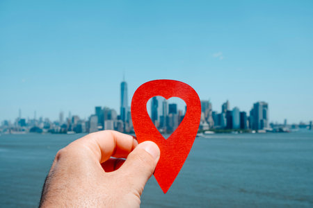 the hand of a man holding a red marker with a heart-shaped hole pointing the Financial District, in Manhattan, New York, United States, as is seen since the bay, in the foreground