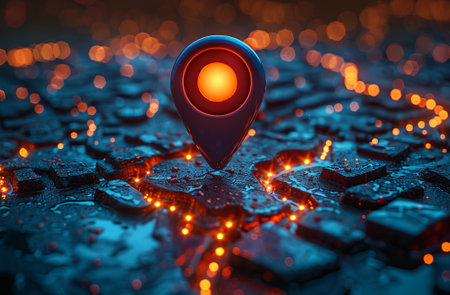 A visually captivating image showcasing a glowing map pin over a richly illuminated urban area, representing connectivity, modernity, and exploration of geographical landscapes.