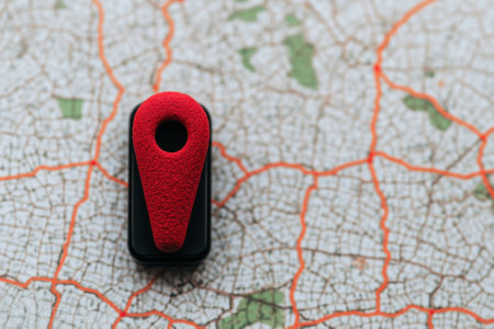 A red map marker is placed on a detailed map, highlighting a specific location. The composition features a shallow depth of field, emphasizing the marker and its surroundings. The map displays detailed lines and colors, while the lighting creates shadows and highlights, suitable for commercial applications.