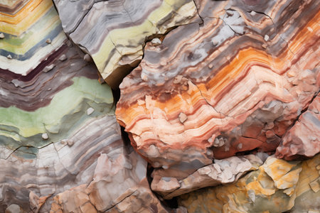 textures of various clay layers underground in clay quarry after geological study of the soil. colored layers of clay and stone in section of the earth, different rock formations and soil layers.