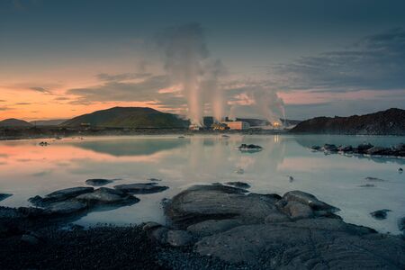 Unbelievable morning view of typical Icelandic Thermal Power Plant. Fantastic summer sunrise in Iceland, Europe. Traveling concept background.