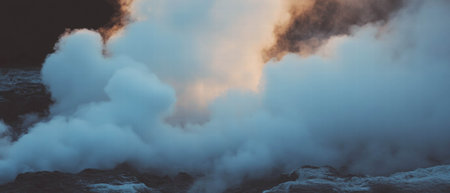 a geyser fills the air of an Icelandic volcanic landscape with water steam, creating a sense of mystery and adventure. The scene is both beautiful and eerie
