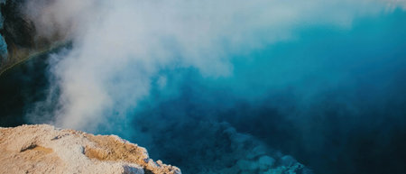 Aerial view of geothermal hot spring in rocky desert vibrant blue water with steam