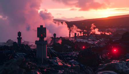 A geothermal plant produces steam as the sun sets over a dramatic volcanic landscape. Dark clouds blend with the vibrant colors of dusk, illuminating the pipes and machinery.