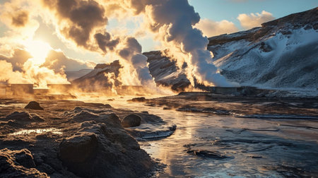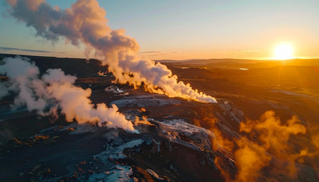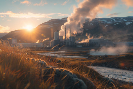 A geothermal power plant in the soft, warm light of the setting sun, symbolizing the harnessing of the earth's natural heat for energy