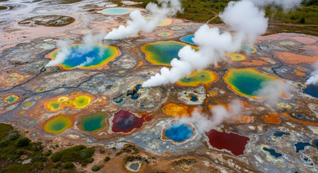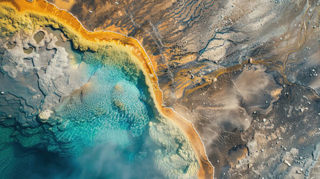 Discover a stunning aerial perspective of vibrant geothermal springs, showcasing rich colors and intricate patterns in the natural landscape, blending water and earth beautifully.