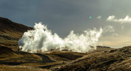 Clouds of water vapor smelling sulfur sprouts in the Hverir volcanic area, Iceland