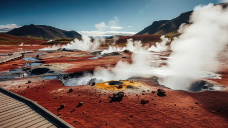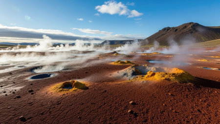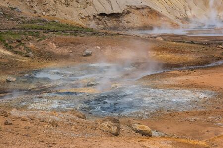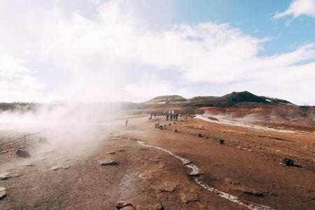 Namafjall Hverir geothermal area in Iceland. Stunning landscape of sulfur valley with smoking fumaroles and blue cloudy sky, travel background, tourist attraction