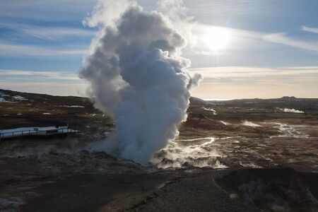 Aerial view of steam cloud at Gunnuhver geothermal park, Reykjanes peninsula, Iceland, Europe. Shot by drone camera.