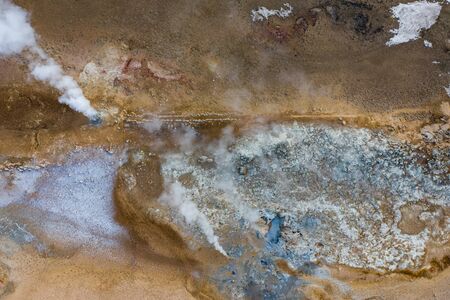 Aerial view of geothermal springs in the location of Hverir. Iceland in early spring