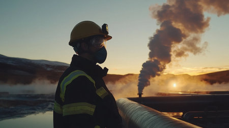 A worker in protective gear inspects geothermal pipes at sunset, highlighting industrial maintenance in renewable energy.