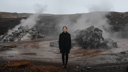 A woman in a black coat stands in a rugged volcanic area with steam rising from rocky formations. The sky is overcast, creating an atmospheric scene filled with geothermal activity.