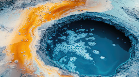 Aerial view of a stunning thermal spring showcasing vibrant colors. The interplay of blue and orange hues reveals the unique geological features of this natural wonder.
