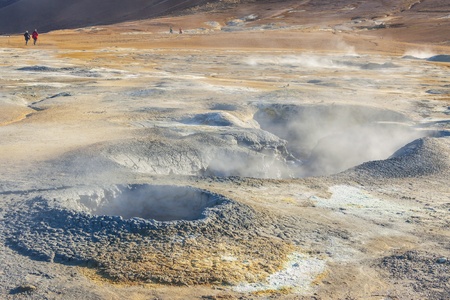 Hverir, geothermal area in Northern Iceland, with steam and mud pools. tourists enjoying the view