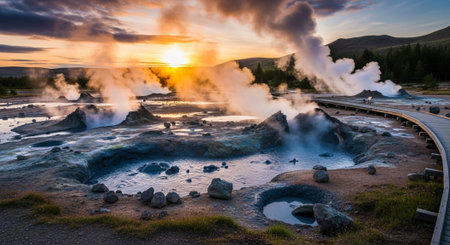 Powerful geothermal geysers emitting steam in a natural landscape at sunrise