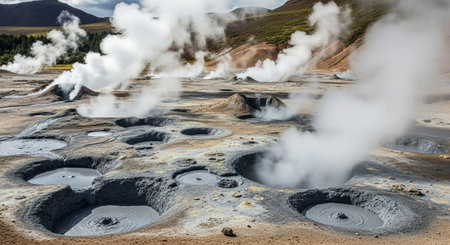 Hverir Myvatn geothermal area with natural steam vents and mud pools all around Lake Myvatn, the Hverir geothermal fields, Iceland