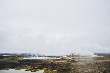 Aerial view of geothermal springs in Iceland in early spring