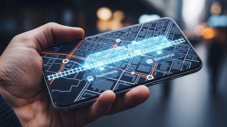 Train showing hand holding smartphone with holographic train overlayed on a digital city map....