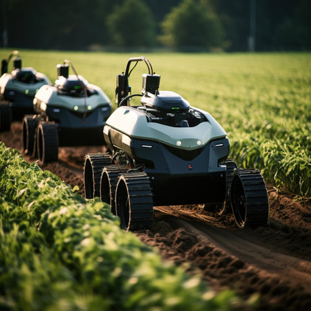 Agriculture robotic and autonomous car robot working in smart farm. Generative AI.