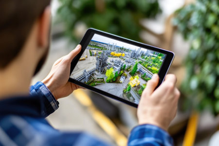 A person interacts with a smartphone showing augmented reality features for drone navigation in a contemporary industrial setting, highlighting advanced technology.
