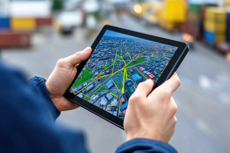 Truck driver and surveyor collaborate outside warehouse, consulting tablet for efficient, precise route planning.