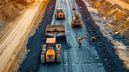 Aerial Shot of Construction Trucks with Asphalt and Bold Yellow Patterns.