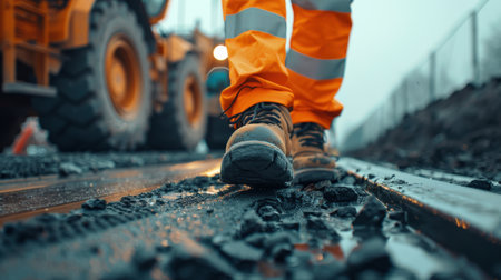 Close-up of construction worker walking on the railway tracks. Heavy machinery and construction equipment.