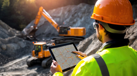 A man wearing a yellow safety vest is holding a tablet and looking at a map. He is likely a construction worker or engineer, using the tablet to navigate or plan a project