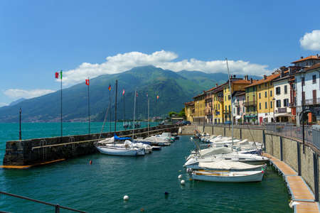 Pier with moored yachts against the background of mountains. Lake Como, Italy