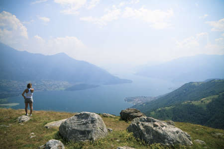 Young woman wearing blue cardigan sitting near lake Como, Alps mountain in background. Concept of summer vacations.