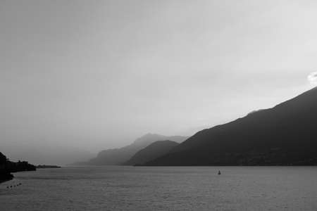 Town of Menaggio at the foot of the mountains in the fog on the shores of Lake Como. Italy