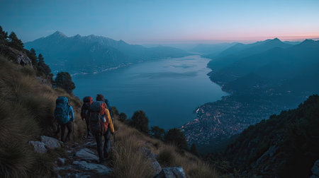 A stunning aerial landscape from a mountain summit, showing a narrow hiking trail leading towards a vast lake surrounded by majestic mountains and a coastal town under a cloudy sky.
