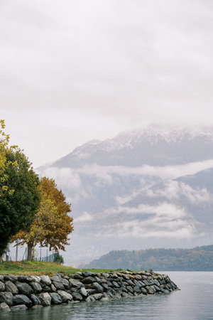 Rock-fortified shore of Lake Como against the backdrop of misty mountains. Italy